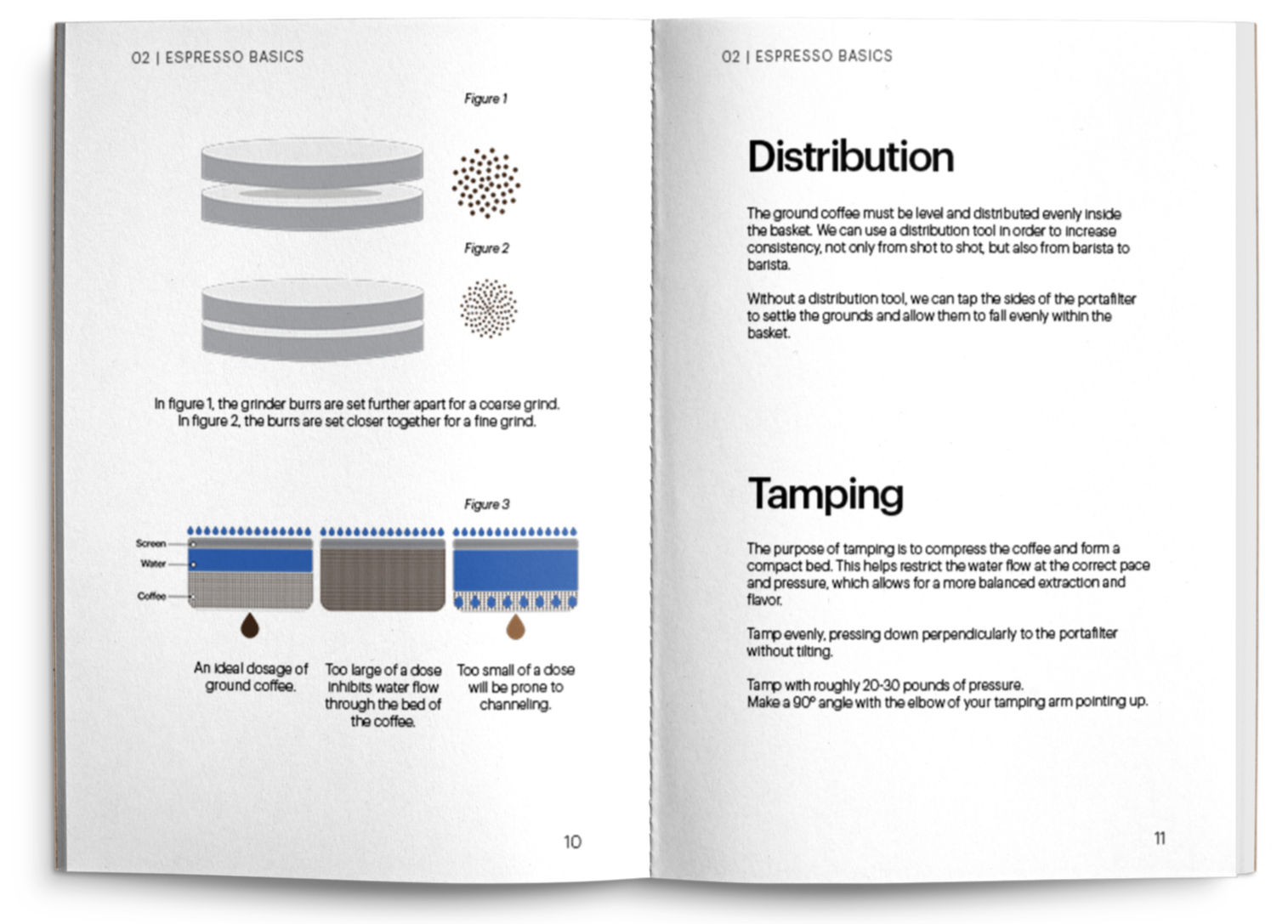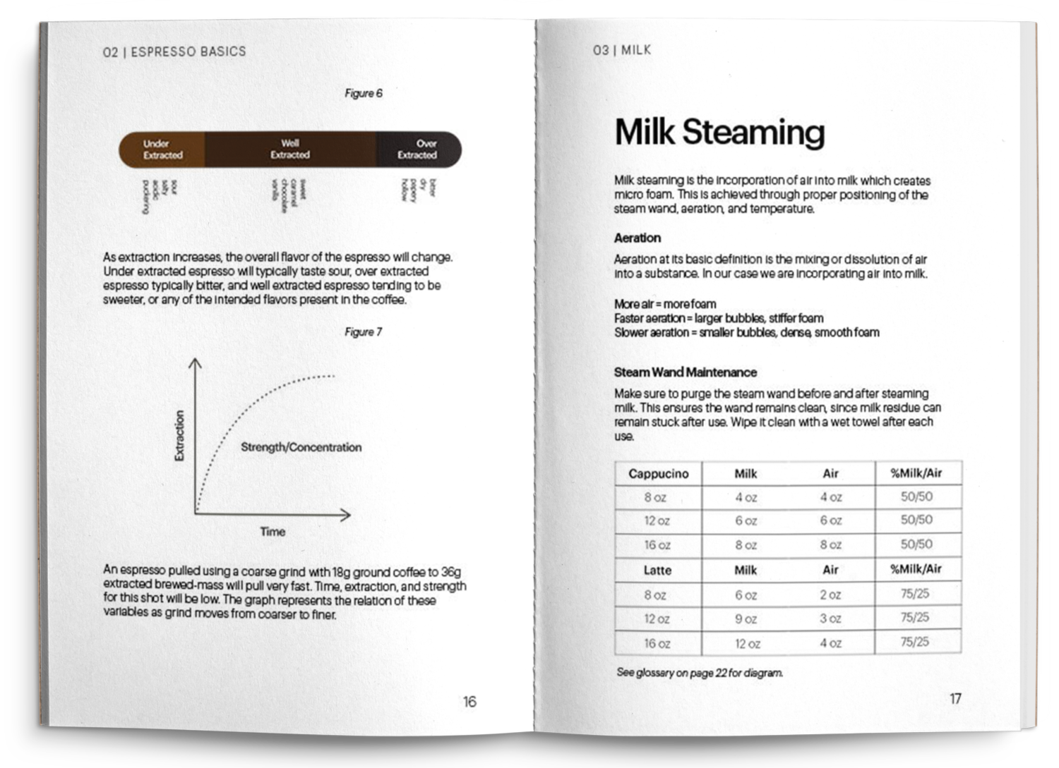 The layout of the book spreads were improved to support the ease of use for baristas. Text and relevant graphic elements were display on the same spreads to make it easier to follow along. In the previous version of the handbook, diagrams and text were separated, requiring the user to flip back-and-forth to connect information. Making sure those elements are seen together helps the reader navigate and understand ideas better throughout the book; some examples are the machine and dose diagrams, and the drink glossary.